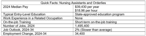 - Job Outlook: Overall employment of nursing assistants and orderlies is projected to grow 2 percent from 2024 to 2034, slower than the average for all occupations. Despite limited employment growth, about 211,800 openings for nursing assistants and orderlies are projected each year, on average, over the decade. Most of those openings are expected to result from the need to replace workers who transfer to different occupations or exit the labor force, such as to retire.”