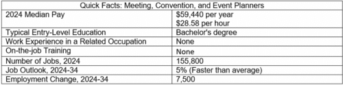 - “Pay: The median annual wage for meeting, convention, and event planners was $59,440 in May 2024.