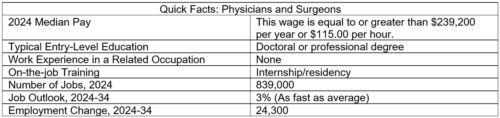 - Job Outlook: Overall employment of physicians and surgeons is projected to grow 3 percent from 2024 to 2034, about as fast as the average for all occupations. About 23,600 openings for physicians and surgeons are projected each year, on average, over the decade. Many of those openings are expected to result from the need to replace workers who transfer to different occupations or exit the labor force, such as to retire. Growing demand for psychiatric care and improved access to mental health services will support job growth for psychiatrists. Meanwhile, the expected decline in the child population may constrain demand for pediatricians and pediatric surgeons.”